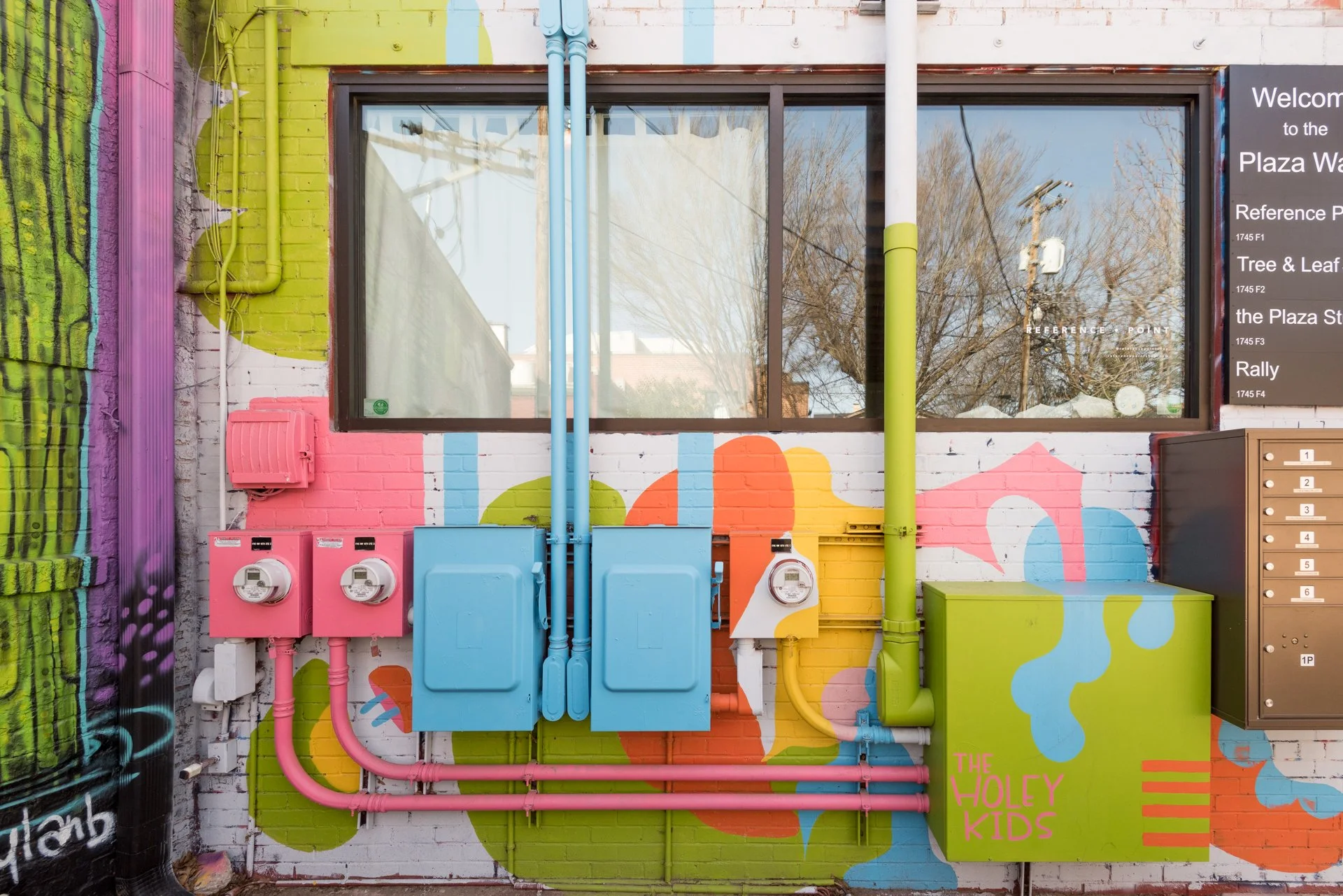New clerestory windows added along the alley exterior walls a to bring natural light into new suites while allowing brick wall below to serve as canvas for everchanging murals known as the "plaza walls"